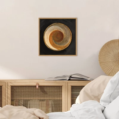 ART DESCRIPTION: A woven brown basket appears in front of a stark black background, viewed from above. The baskets tan rim and inside weave are displayed, showing a rough circular pattern with deep rust and beige swirls. This Amanti Art canvas art print was created by Albena Hristova and printed by Amanti Art in Madison WI. The canvas is stretched by hand and finished with a float frame. Individually made using traditional custom framing techniques, it has the quality you would expect from your local frame shop. Because of our attention to detail and focus on artistry, architects, interior designers, and homeowners alike choose this framed canvas artwork to create beautiful living spaces.