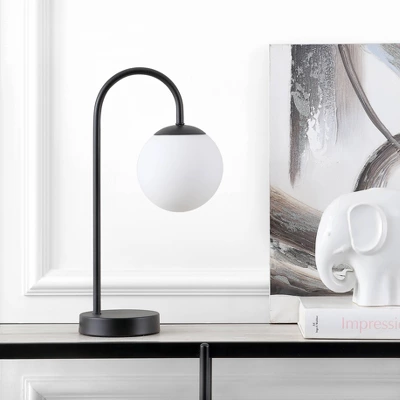 With its sleek lines and black metal finish, this arched table lamp has a modern, minimalist-inspired aesthetic. The frosted glass globe shade diffuses the light from a single LED bulb. Add some mood lighting to a living room, bedroom or dining room; order two for a chic, modern console table.