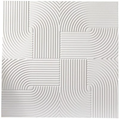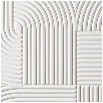 - White geometric wall art highlights a minimalistic square board adorned by curved ripple patterns
