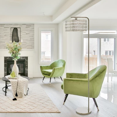 Add a glam lighting option to your bedroom, living room or foyer with this 61.5″ H Quigley Silver Drum Shade Floor Lamp from River of Goods. This floor lamp showcases a chrome-finish silver metal candlestick base and a white fabric drum shade with silver metal charms for a standout look with a touch of shine. The lamp requires one 60-watt E26 bulb (not included) to cast a soft, warm glow, and the 90-inch cord with a foot switch allows for versatile placement in any room.
