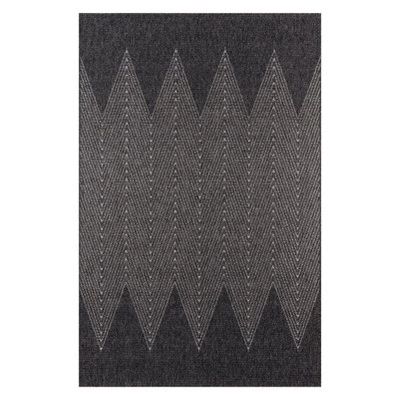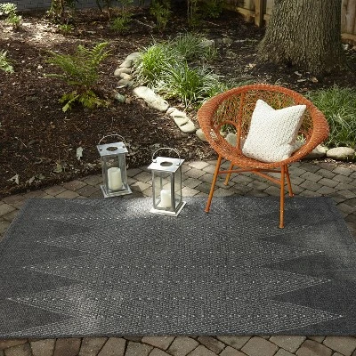 In the particular design, primitive patterns meet a Park Avenue aesthetic. The decorative rug is at once exotic and architectural with bold geometric lines that zigzag across the center of the black rug field. Precision made from polypropylene fibers, the all-weather rug is a stain-resistant floorcovering suitable for styling both interior and exterior environments.