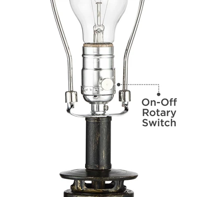 Add a hardy industrial look to your nightstand or side table with this rugged metal table lamp from Franklin Iron Works. The weathered bronze finish base is cleverly designed to resemble a traditional coal miner’s lantern, with a clear glass accent in the middle. An oatmeal fabric shade on top is the perfect finishing touch to this handsome design.