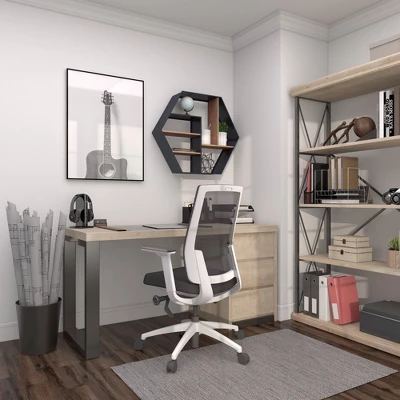 - •This industrial wall shelf accentuates a hexagon shape with various size shelves