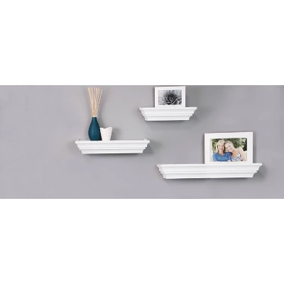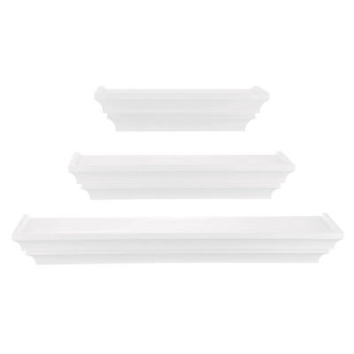 - SET OF 3 FLOATING WALL SHELVES – Display decorative items, prized possessions and keepsakes on functional, classic shelves. Elevate your décor and fill spaces above a desk, fireplace, entryway, vanity, between windows and more.
