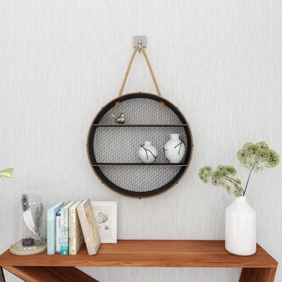 Display against a light-colored wall for the full industrial effect. This item ships in 1 carton. Can be hung horizontally using the jute rope; nails and screws not included. Suitable for indoor use only. This item ships fully assembled in one piece. Maximum weight limit is 20 lbs. This is a single black colored floating shelf. Metal wall shelf features 2 shelves. Industrial style.