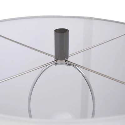 The modern Accolti floor lamp has a white shade and a tripod frame of black nickel with a textured gray finish and a crystal accent. Sure to capture attention in a living room or family room, this tall lamp features a three-way switch. The cylindrical black nickel finial at the top is the finishing touch on this stunning steel and crystal floor lamp. Due to lighting and monitor differences, actual colors and finishes may vary slightly from what appears online.