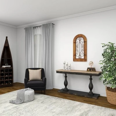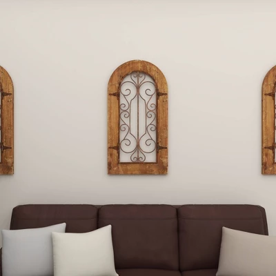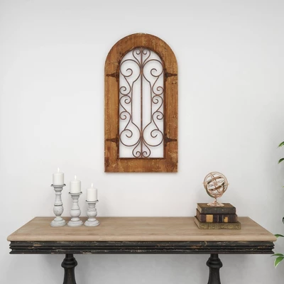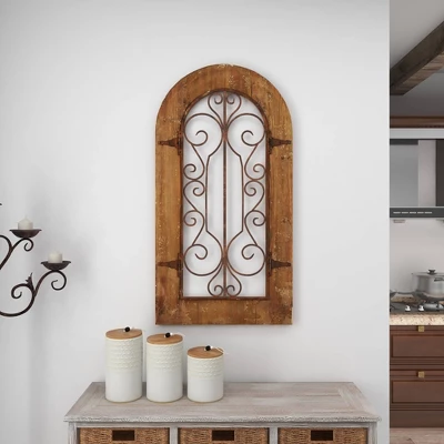 - •Versatile, distressed natural brown tones throughout the wood frame with an arched window silhouette and decorative metal hinges housing ornate metal scrollwork